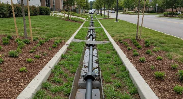 - Les jardins de pluie : ces aménagements paysagers collectent et filtrent les eaux pluviales, permettant une absorption naturelle par le sol.